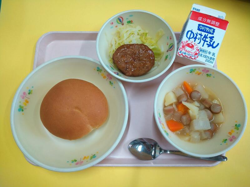 今日はてりやきバーガーです。バーガーパンにキャベツとてりやきチキンパティをはさんだら出来上がりです。ポトフは、フランスの家庭料理です。牛肉やウィンナーなどの肉、大きく切ったにんじん、たまねぎ、かぶ、セロリなどの野菜をグツグツとじっくりにこんで作ります。日本でいうと、おでんのような料理です。いろいろな食べ物をいっしょに食べられるので、栄養たっぷりで、体も温まりますね。野菜たっぷりの料理ですが、みんな大好き、いつもほぼ完食です。