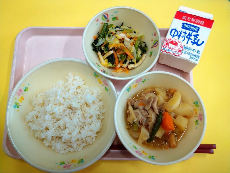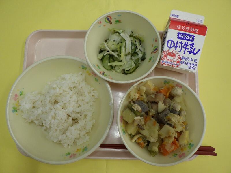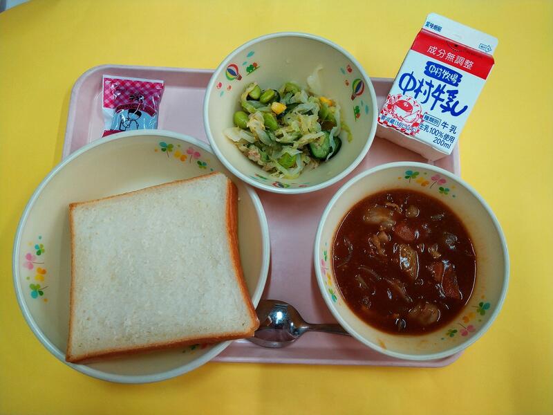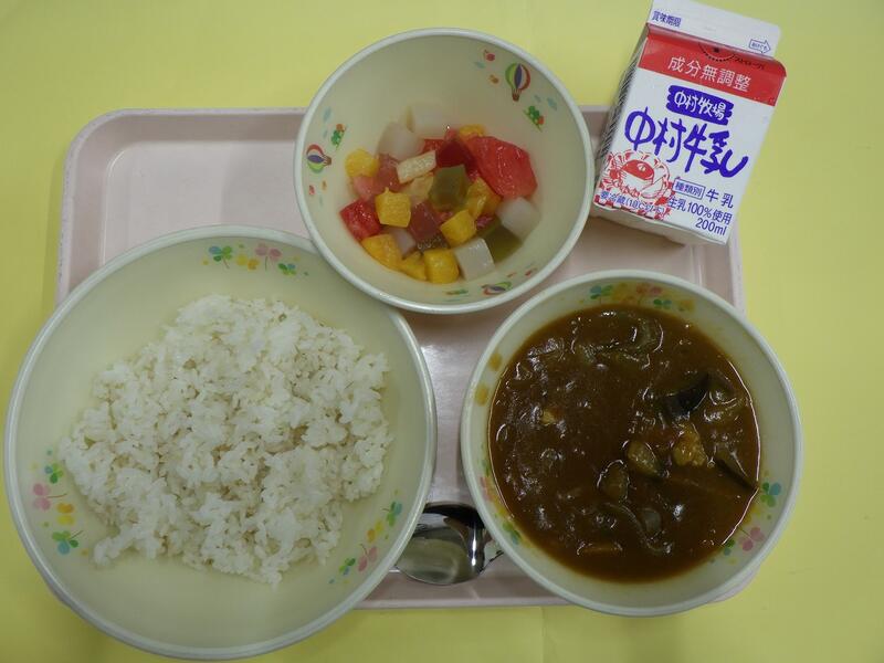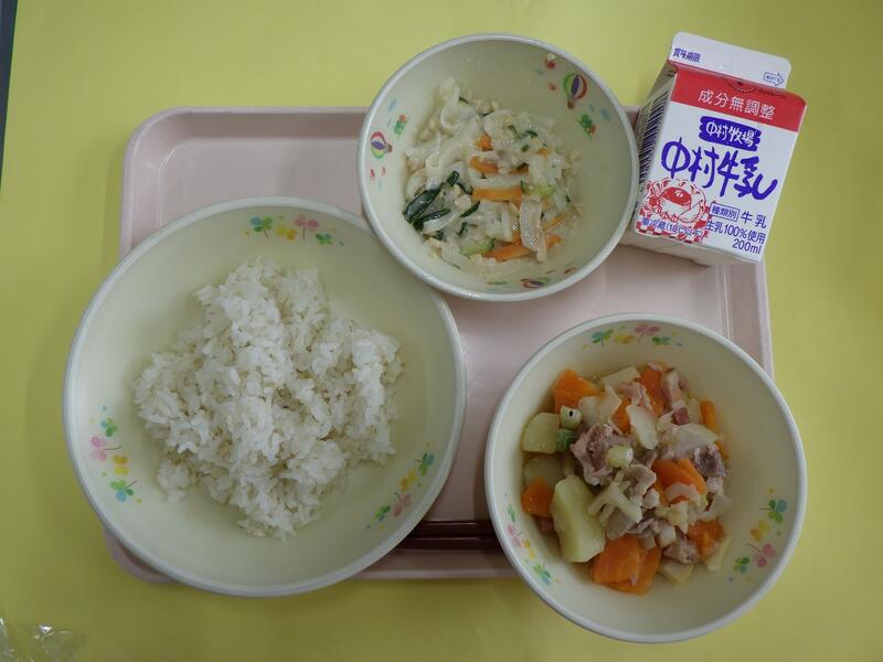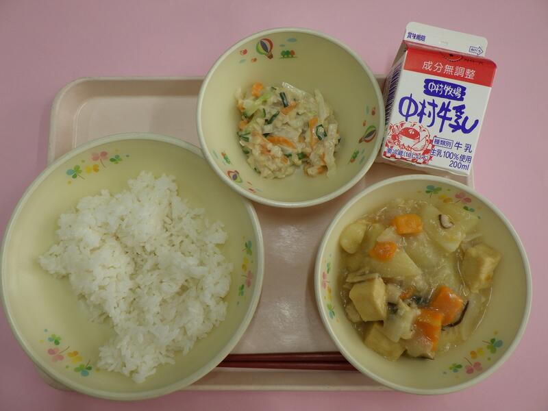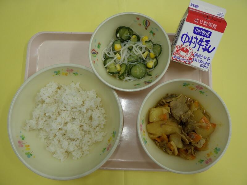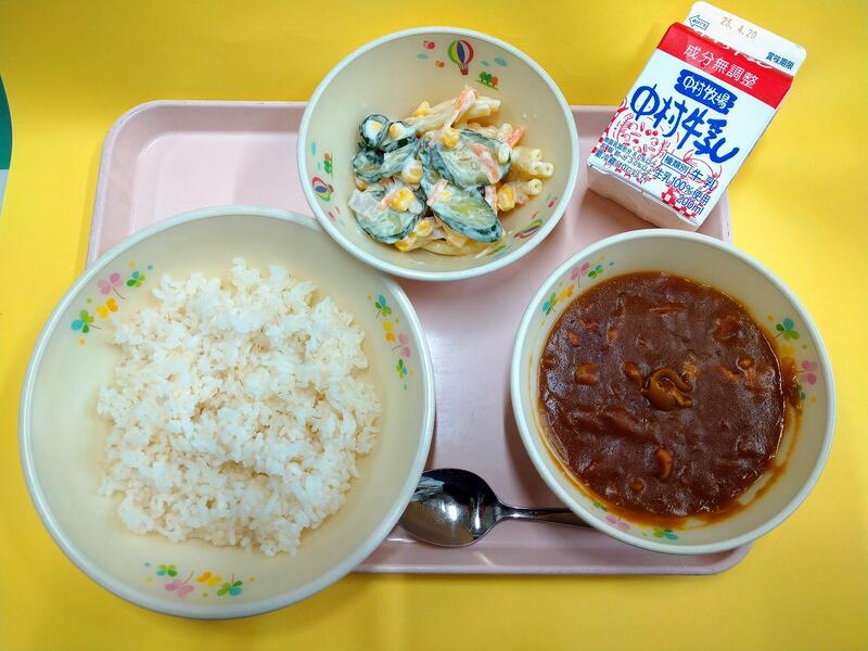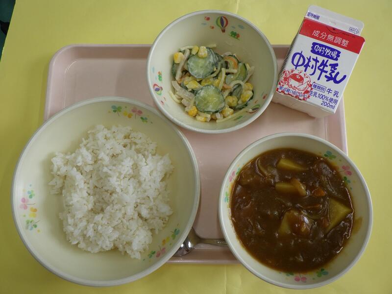 小学校に入学された1年生のみなさん、ご入学おめでとうございます。新しい教室、新しいクラスのお友だち、まだ少しきんちょうしているお友だちもいるかもしれませんね。給食を食べて、楽しい時間を過ごしてくださいね。学校の給食は、木曜日がパンの日、他の日はごはんの給食です。今日は給食でとても人気のカレーです。宮崎県産のとり肉やじゃがいも、たまねぎ、にんじんからのおいしさがたくさんつまっていますよ。