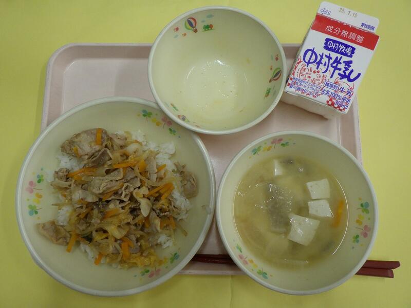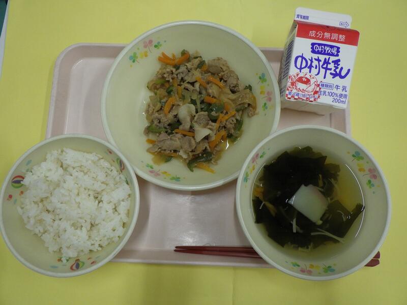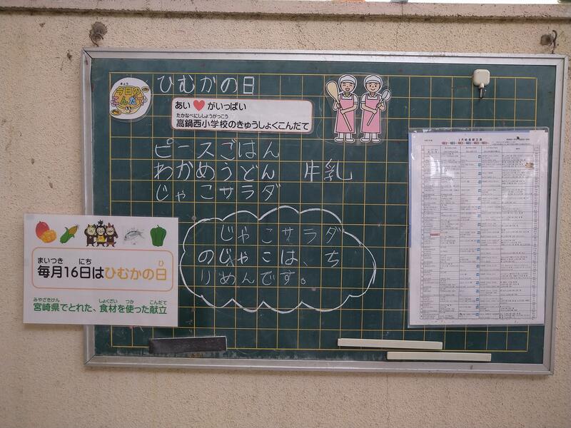 今日は「ひむかの日」献立です。「ひむかの日」の給食は、宮崎県産の食べ物を取り入れて、みなさんに紹介します。今日は、宮崎県産のぶた肉と野菜で焼肉を作りました。給食でも家でもよく食べられているぶた肉ですが、もとは野生のイノシシを飼いならしたのが始まりです。肉から内臓、耳や足まですてるところなく使えるので、世界でもよく食べられ、いろいろな料理があります。また、ぶた肉からハムやベーコン、ウィンナーも作られます。
