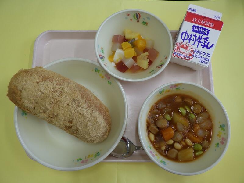 今日は、みなさんの大すきなあげパンです。きなこにココアを混ぜたココアあげパンです。朝長田パンさんから届いたコッペパンを油であげて、ココア、きなこ、さとうをひとつひとつパンにまぶして作りました。給食のこん立の中で作るのがたいへんな料理のひとつですが、みなさんにおいしく食べてもらおうと、調理の方がいっしょうけんめい作っています。きなこあげパンとどちらが好きですか?