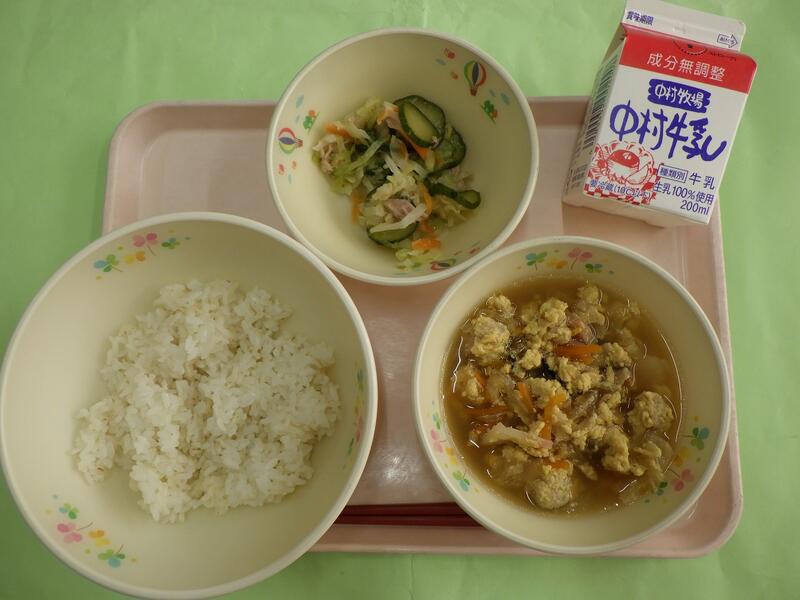 今日は「ひむかの日」献立です。宮崎県産の鶏肉とゆず果汁を使って「ゆず風味揚げ」を作りました。鶏肉というと、主に、にわとりの肉のことをいいます。にわとりは、もともと東南アジアに住んでいたキジの仲間で、3000年以上前から私たち人間に飼われてきました。日本では、奈良時代ごろから飼われ、卵をとったり、食べたりするために飼われるようになったのは明治時代からです。鶏肉は、私たちの体をつくる「たんぱく質」がたくさん含まれています。肉の繊維が細くてやわらかいので、消化がよいお肉です。