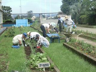 今日は、地域のボランティアのみなさんが花壇の除草作業と花の植え付けの作業をしてくださいました。久しぶりの晴天で気温も30度近い中の作業です。