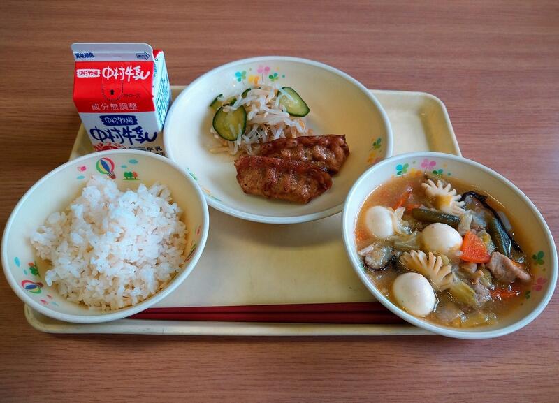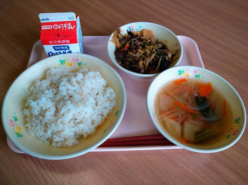「今日は一年で一番昼が長い日で冬至と言います。この日は、かぼちゃを食べたり、ゆずを浮かべたお風呂;ゆず湯に入ったりして、健康を願います。冬至には、『ん』の付くものを食べると運がよくなると言われています。かぼちゃは、『なんきん』とも呼ばれるので、冬至に食べるとよいと言われています。今日の給食は、宮崎県産のかぼちゃとかぼちゃをすりつぶしたピューレを使って『パンプキンポタージュ』にしました。寒い冬、みなさんが健康に過ごせますように。」