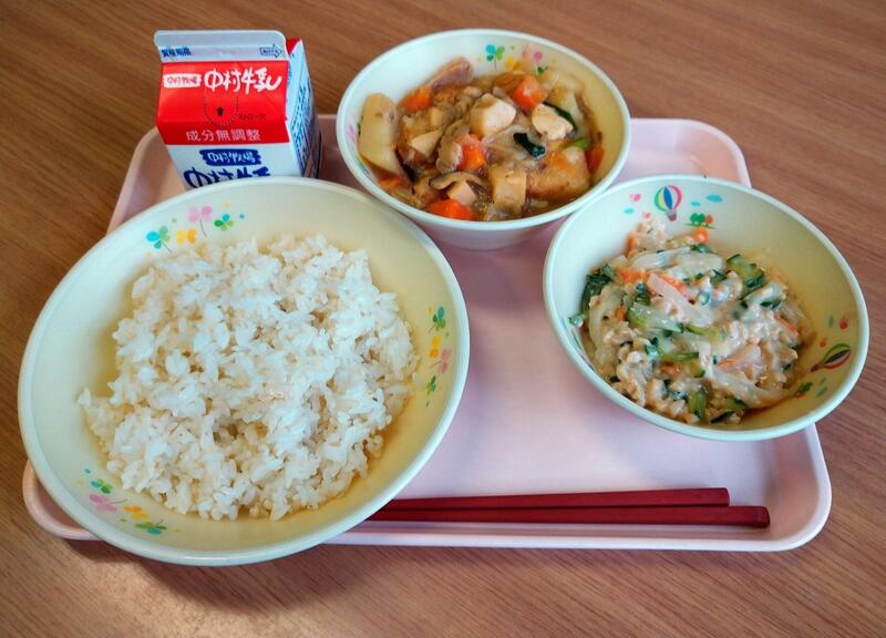 「今日は16日、『ひむかの日』献立です。宮崎県内でとれた食べ物や宮崎県の郷土料理を皆さんに紹介しています。今日は、宮崎県産のゆずをしぼって、サラダを作りました。ゆずは、ミカンやオレンジの仲間、かんきつ類の中で一番寒さに強く、日本のいろいろな所で作られています。5月には花が咲き、その後、小さな実がなります。7月ごろに青い実が大きくなり、11月ごろから黄色くなります。香りがいいので、日本料理によく使われます。皮は、小さく切ったり、千切りにしたりして汁物や和え物に使われます。しぼり汁は酢の代わりに使われます。他にも、ゆずみそやゆべしというお菓子、ジャムやゼリーも作られています。」