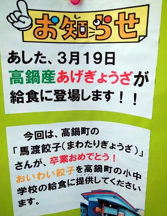 「高鍋町といえば、ぎょうざ」といわれるほど、町内にはぎょうざのおいしいお店があります。ここ数年は、「毎月3日はぎょうざの日」ということで、おいしいぎょうざをアピールする取組が行われているようです。今月は町内のぎょうざのおいしいお店から、高鍋町の小学校、中学校の給食にぎょうざを提供していただきました。給食室のフライヤーでこんがり揚げましたよ。感謝しておいしくいただきましょう。