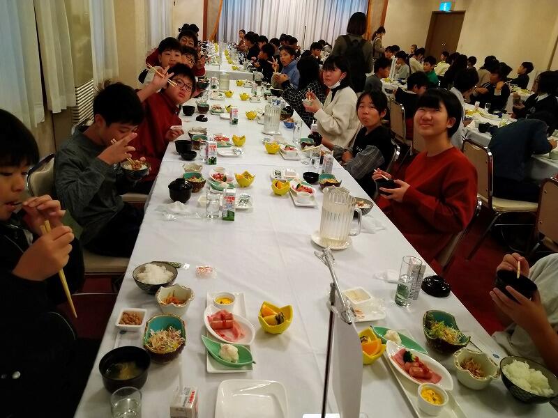 起床6時。眠そうな顔もあれば、朝から元気な声も…朝食時間にはしっかり全員集合。朝から食欲旺盛な6年生。その後の退館式でも立派なあいさつができました。今日も快晴。近くには桜島もきれいに見えます。よい1日のスタートが切れました。