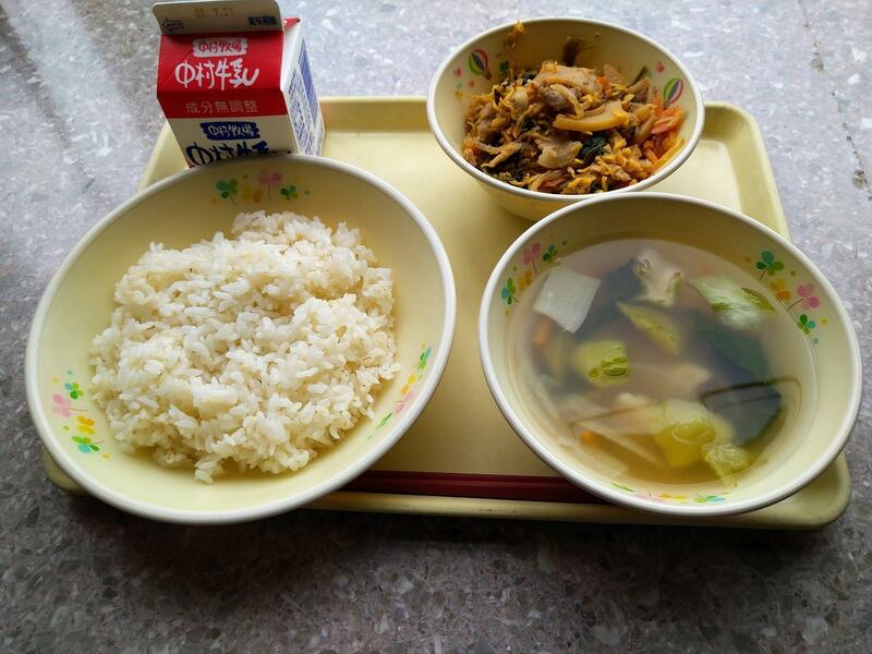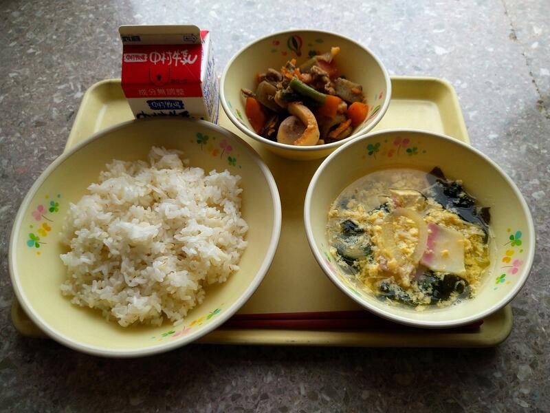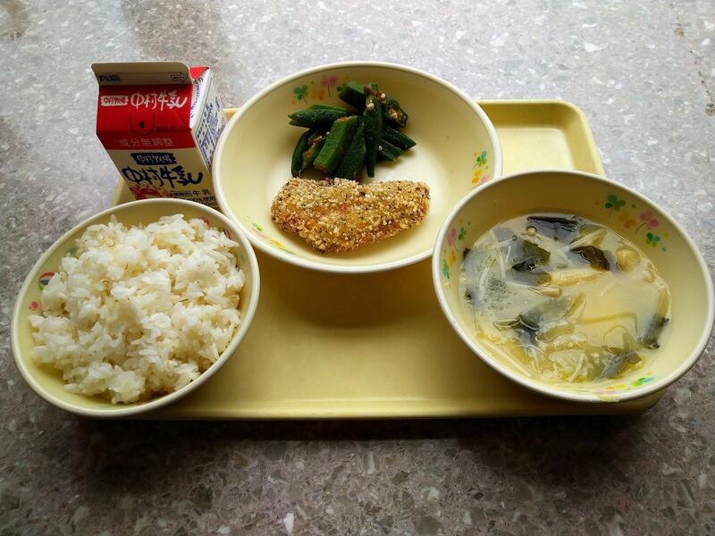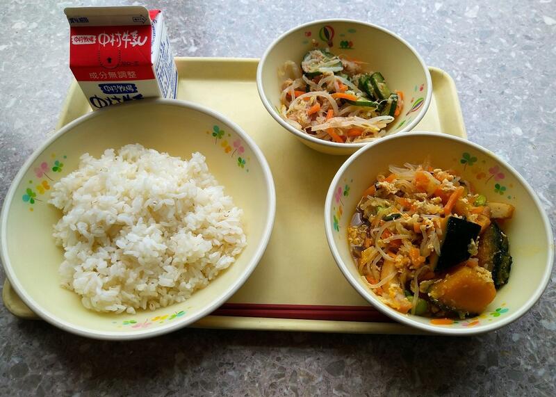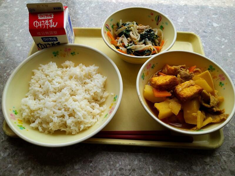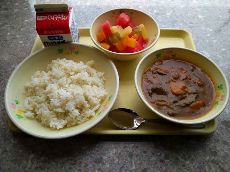 「今日は、ドライカレーです。ご飯に大きいおかずをかけて食べましょう。給食では高鍋町でとれたお米を炊いています。『夏の笑み』という種類のお米です。『夏の笑み』は、宮崎県の農業試験場で開発、登録された新しい種類のお米です。今は、宮崎県内でのみ作られています。『コシヒカリ』というお米に比べて1か月から2か月短い期間でお米ができます。稲の背丈が低く、台風などの強い風によって倒れにくい特長があります。お米の粘りが強く、炊き立てはもちろん、冷めてもおいしいお米です。今日は、今年とれた新米を炊いたご飯ですよ!よく噛んで食べると、お米の甘さが口の中に広がりますよ。」