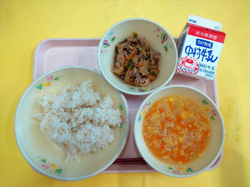 〇 むぎごはん 〇 たまごとコーンのスープ