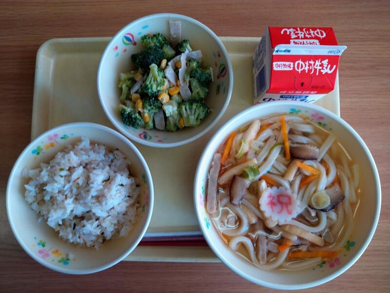 「1年生の皆さん、ご入学おめでとうございます。新しい教室、クラスのお友達にまだ少し緊張しているかもしれませんね。給食を食べて、楽しい時間を過ごしてください。高鍋町の小学校の給食は、月・火・水・金曜日がご飯の日です。高鍋町でとれた『夏の笑み』というお米に麦を少し混ぜて炊いています。麦はおなかの中をきれいにしてくれる食物繊維や、体のの筋肉になるたんぱく質が米より多く、健康に気を付けていた徳川家康は、麦ごはんをよく食べて、当時としては長生きの75才まで生きました。」