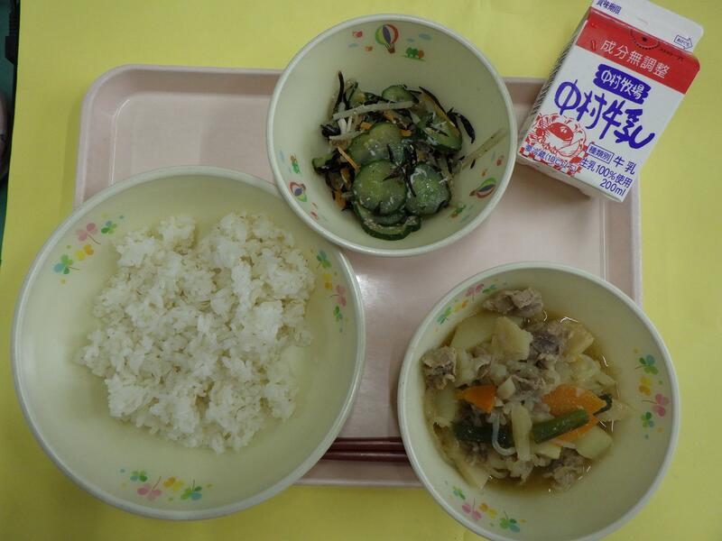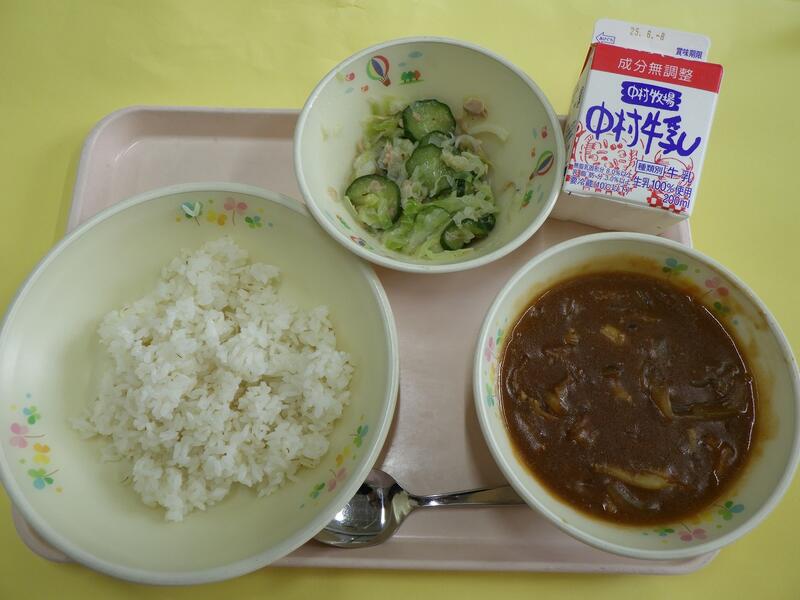 今日は「ハヤシライス」です。ごはんに大きいおかずをかけて食べましょう。きゅうりは、もともとインドのヒマラヤ山ろく近くの野菜で、そこから西アジアやヨーロッパ、東アジアへ、そして世界中に広まり、400種以上の品種があるといわれます。日本では夏の代表的な野菜でしたが、ハウスさいばいがさかんになり、一年中食べられるようになりました。皮にイボがありますが、これは果肉を守るためのもので、イボがするどいものほど新鮮です。