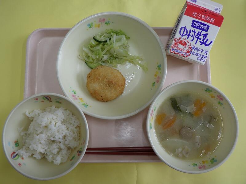 〇 麦ごはん 〇 野菜スープ 〇 ハンバーグ