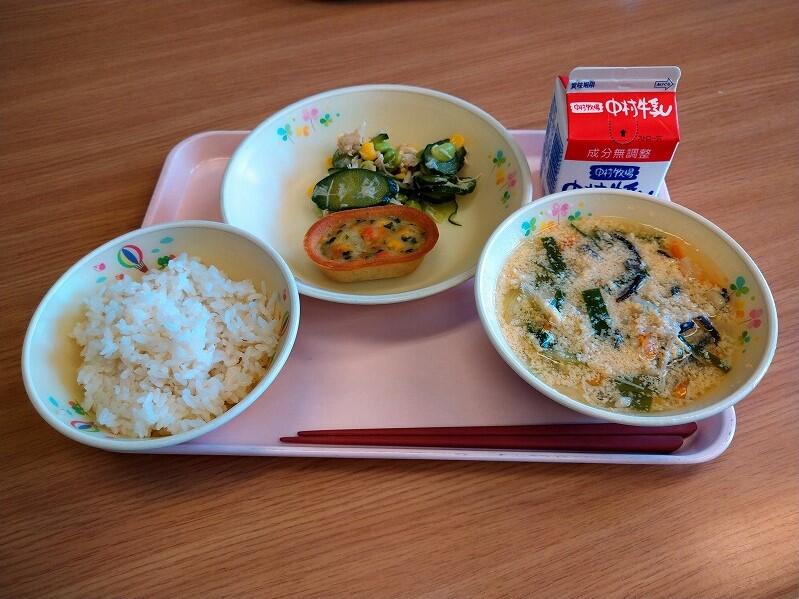 今日の給食の「カップグラタン」は、じゃがいもをカップにしているので、カップごと食べられる環境にやさしいメニューです。美味しいうえに環境についても学べる給食です。