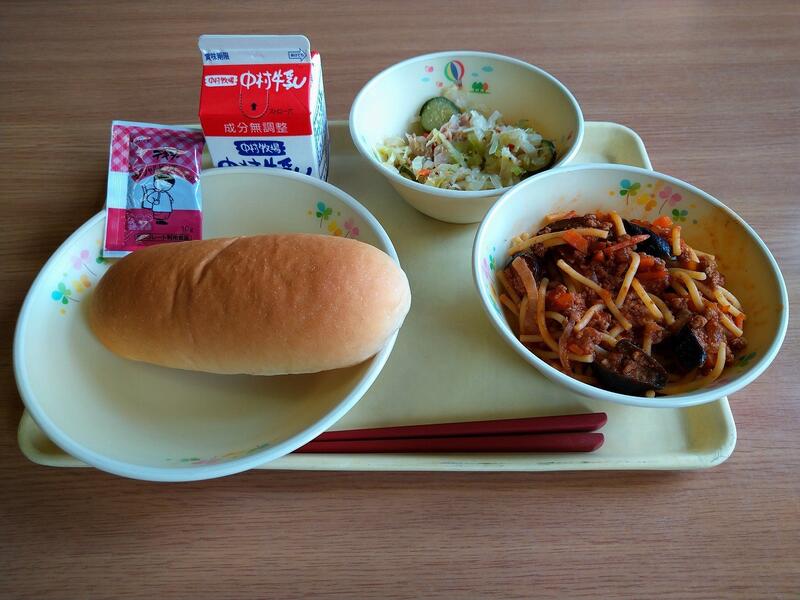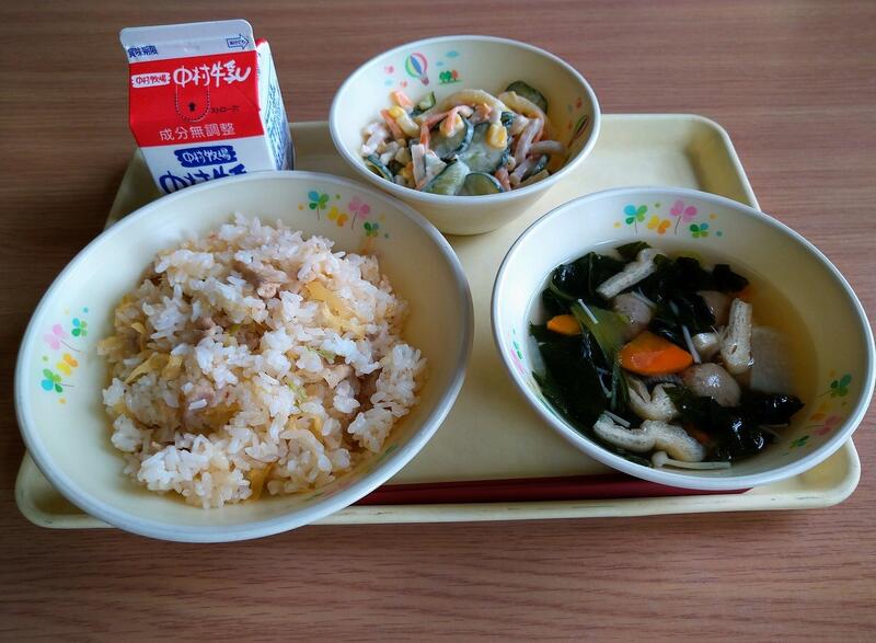 「きゅうりが日本でたくさん作られるようになったのは、江戸時代です。その頃は青いうちに収穫せずに黄色くなってからとったので、黄色い瓜というのがなまってきゅうりと呼ばれるようになったと言われています。きゅうりは、もともとは夏にたくさんとれる野菜です。今ではハウス栽培も増えて、一年中お店で見かけますね。給食では、宮崎県でとれたきゅうりを使っています。今日は、サラダに入っています。ふるさとの味をおいしくいただきましょう。」