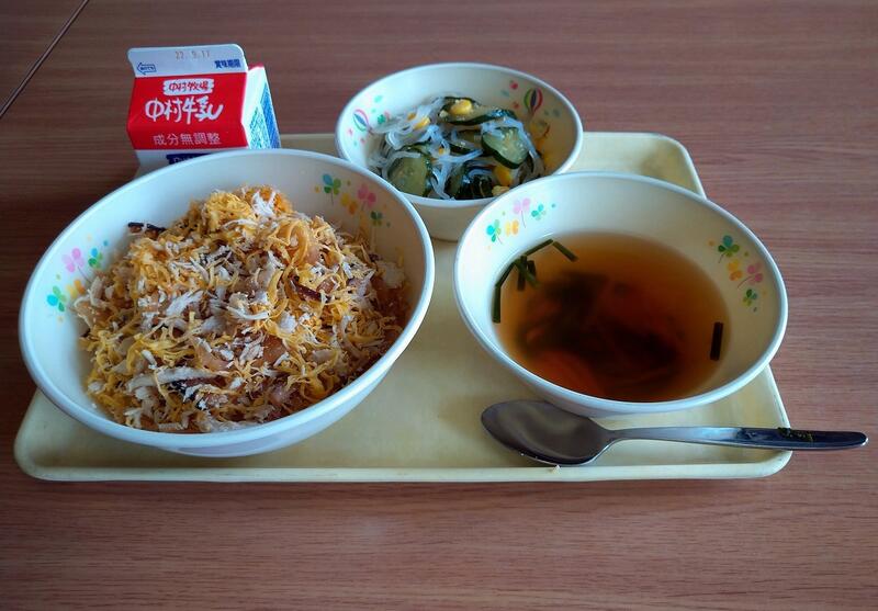 「今日は『鶏飯』です。鶏飯は鹿児島県の奄美大島の郷土料理です。お茶碗によそったご飯に、ゆでてほぐした鶏肉、錦糸卵、しいたけ、パパイヤのつけものやたくわん、ねぎ、きざみのり、ゴマなどをのせて、鶏を煮てとったスープをかけて食べます。昔、奄美の人たちは、さとうきびを育てて黒砂糖を作り、薩摩藩におさめていました。鶏飯は薩摩藩本土から来る役人をもてなすために作られたと言われています。その時は鶏肉の炊き込みご飯のようなものでしたが、戦後、今のような形になりました。」