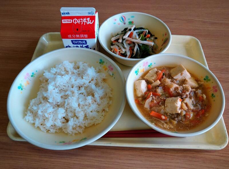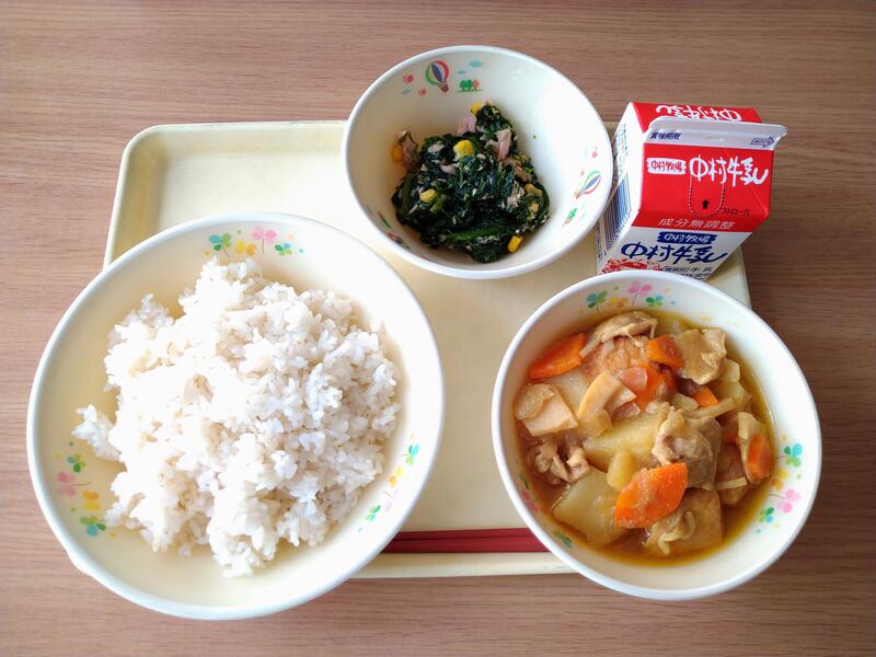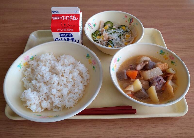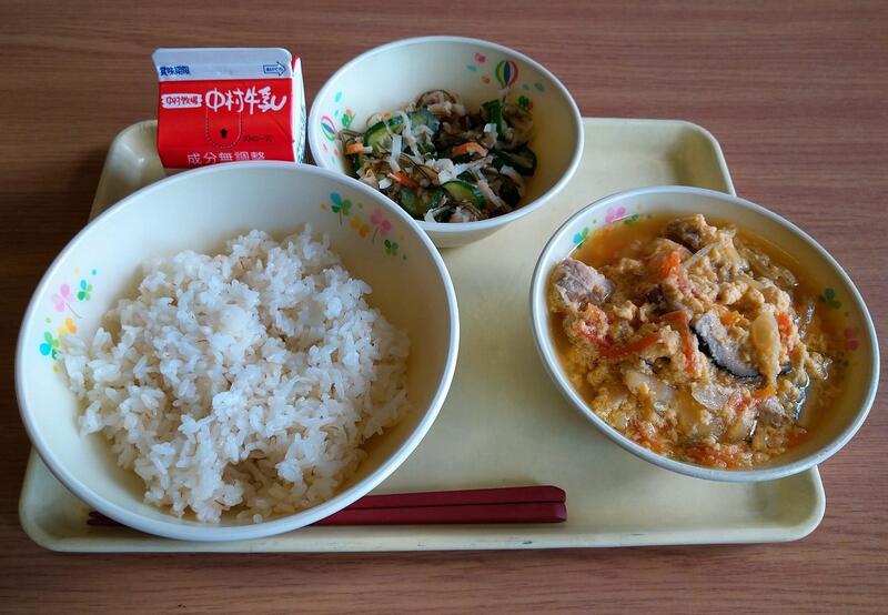 「今日は親子丼です。大きいおかずをご飯にかけて食べましょう。卵が食べられるようになったのは、明治時代になってからで、その頃はまだ値段の高い食べ物でした。今のように広く食べられるようになったのは、ニワトリの飼育方法が変わり、大量生産ができるようになってからで、今から60年位からです。私たちの体をつくるたんぱく質や血液のもとになる鉄、ビタミン等がたくさん含まれています。」