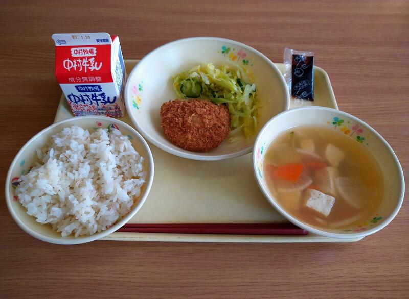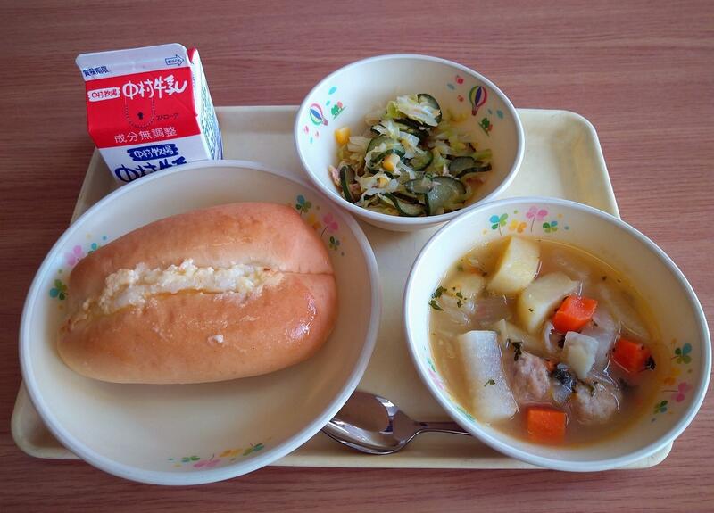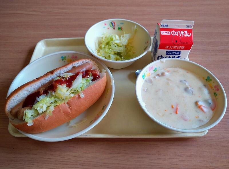 「今日はウィンナードッグです。ドッグパンにキャベツをはさんで、その上にウィンナーをのせ、上からケチャップソースをかけたら出来上がりです。パンの歴史は古く、今から6000年位前にエジプトで作られました。その頃は、小麦を石をつぶして粉にして、それを水で練って平らにのばし、熱く熱した石の上で焼いていました。日本へは400年位前にポルトガル人によって伝えられました。今のようにたくさんの人が食べるようになったのは、学校給食でパンが食べられるようになった昭和30年より後のことです。」