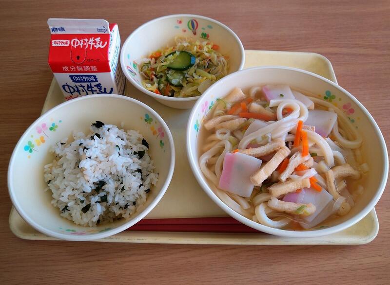 「給食のうどんは、鰹節とアジの子ども『アジ子』でとっただし汁で作っています。5年生になると、家庭科でだしを取り方を習います。和食では、だし汁の役割がとても大きく、煮物や汁物、お浸し、炊き込みご飯等いろいろな料理に使われています。だしにはいろいろな種類があって、鰹節や昆布、いりこ等の食材を水につけ、火にかけて煮出して作ります。鰹節やいりこでとっただしは、魚のうまみがしっかりとしていて、昆布のだしはさっぱりとしたおいしさです。」