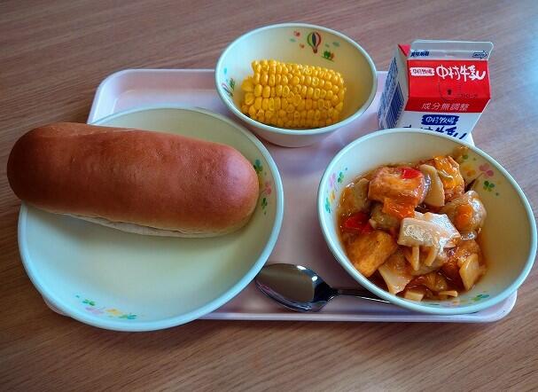 今日は高鍋町産のとうもろこしを塩ゆでした「かみかみメニュー」です。とうもろこしは、朝太陽が出る前に収穫するとよいらしく、生産者の方は朝3時ごろから収穫するらしいです。給食でとうもろこしが食べれる幸せを味わいました。