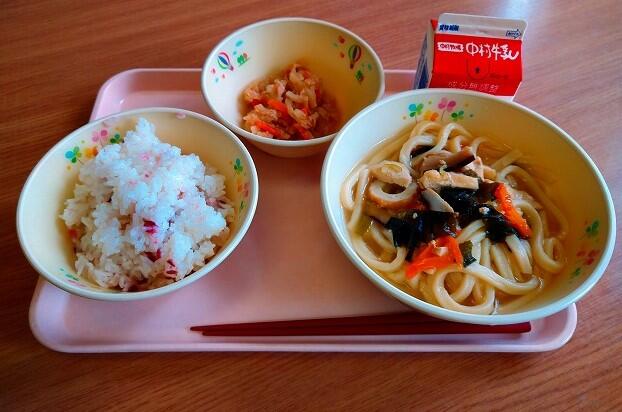 今日は和食の給食です。和食の食器の正しい並べ方は、ごはんが左、お汁を右に置くことが基本とされています。正しく食器を並べることは、食事のマナーの1つです。食事を始める時に、確認してみましょう!