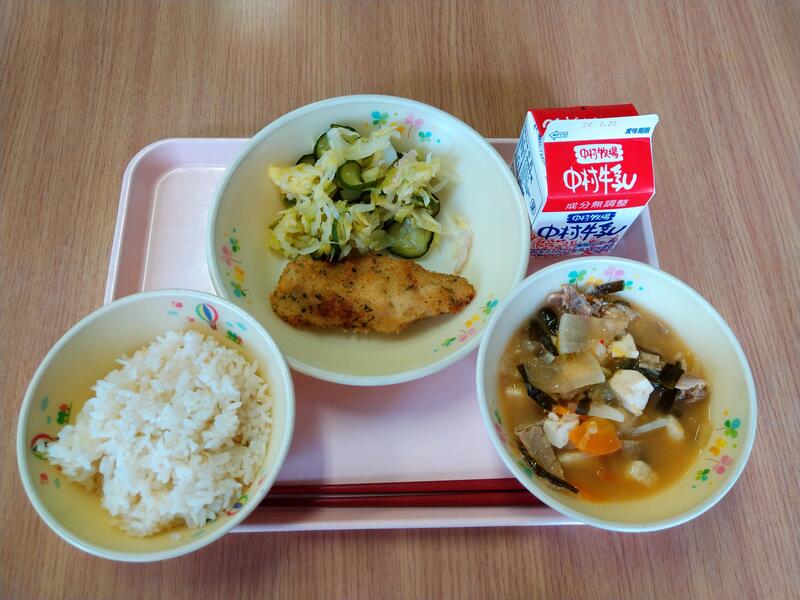 ホキは、オーストラリアやニュージーランド近くでとれる魚です。長さ1メートルくらいまで大きくなり、白身の魚で味にくせがないので、いろいろな料理に使われます。今日は、青のりの入った衣のフライです。お味はいかがですか?キャベツは高鍋産の新鮮な美味しい食材ですよ。