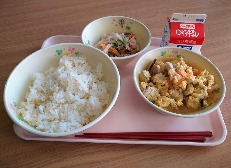 今日は親子丼です。大きいおかずを、ごはんにかけて食べましょう。たまごが一般家庭で食べられるようになったのは明治時代になってからで、そのころはまだ値段の高い食べ物でした。今のように広く食べられるようになったのは、にわとりの飼育方法が変わり大量生産ができるようになってからで、今から60年くらい前からです。わたしたちの体をつくるたんぱく質や血液のもとになる鉄、ビタミンなどがたくさん含まれています。