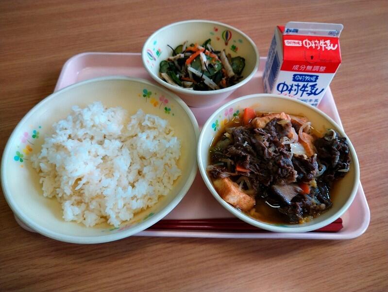 すきやきの肉は、今は牛肉がほとんどですが、牛肉で作るようになったのは明治時代からで、江戸時代にはシカの肉ですきやきを作っていました。その時に、農作業の道具の「スキ」を使って煮たり焼いたりしたことから、「すきやき」といわれるようになりました。あまからい味は、ごはんがすすみますね。今日のすき焼き煮は絶品でした!