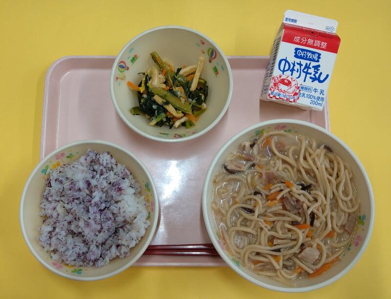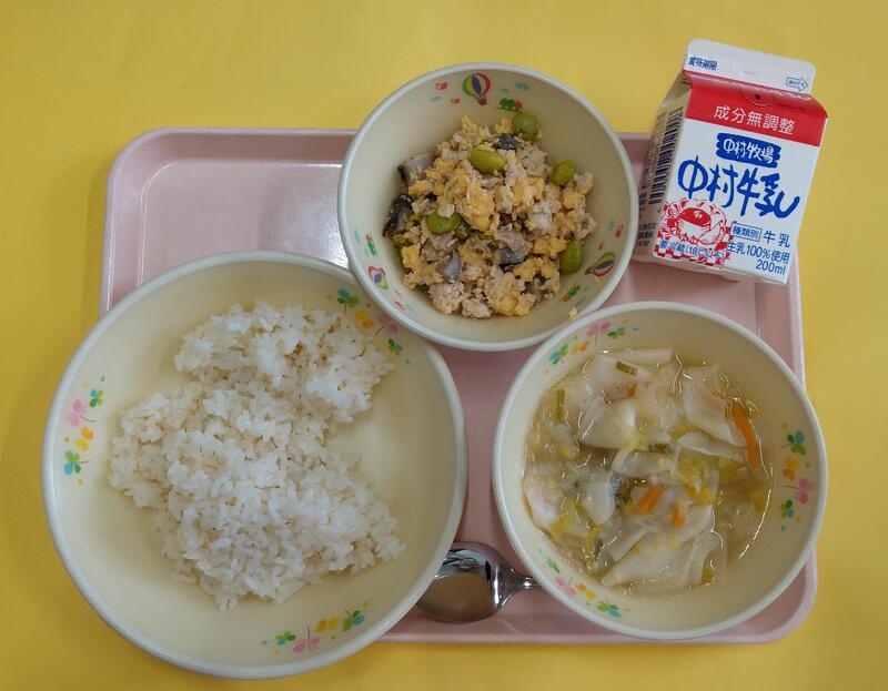 そぼろは「おぼろ」ともいい、もともとはエビやタイ、ヒラメの身にみりんと塩を入れて、すりばちで細かくすりつぶしたものをいいました。その後、ぶた肉やとり肉、牛肉のひき肉をぽろぽろにしたものを「そぼろ」というようになりました。今日は、とり肉としいたけの茶色、たまごの黄色、青豆の緑色の三色がきれいなそぼろ丼です。小さいおかずをごはんにかけて食べてくださいね。よくかんで食べましょう。