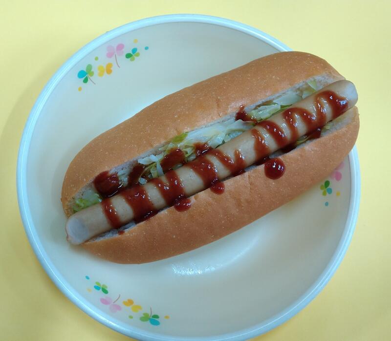 1年生もしっかりパンに挟んで、ケチャップをかけて~おいしくたべていました。自分で作ったウィンナードッグパンは格別ですよね!