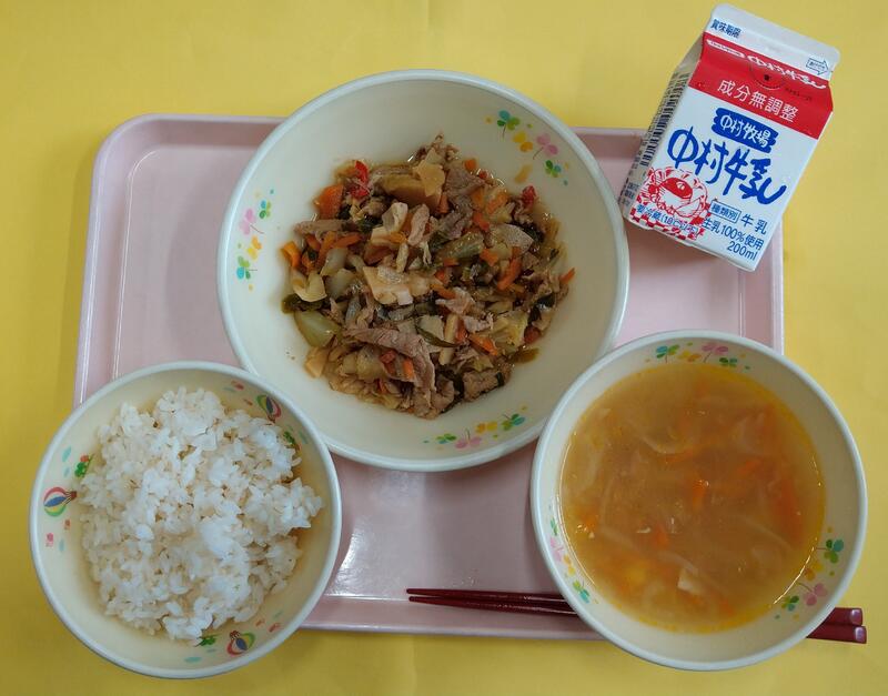 〇 むぎごはん 〇 コーンスープ 〇 ホイコーロウ