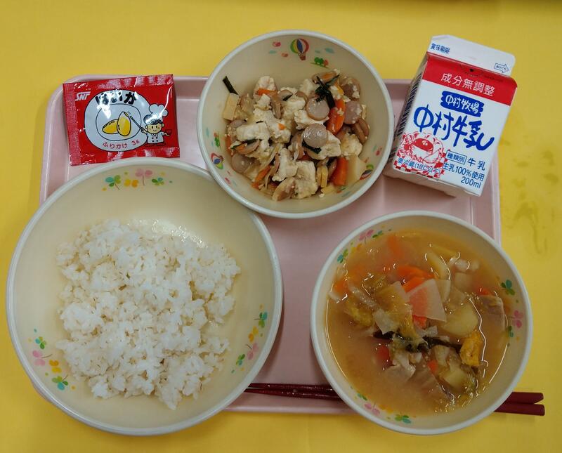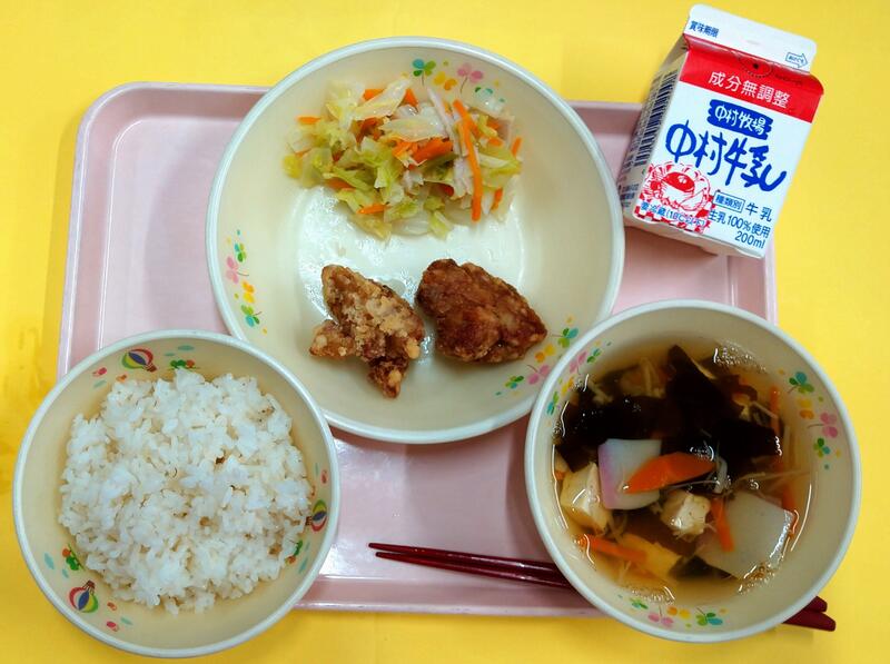 今日は人気メニューの「からあげ」です。給食室から届くにおいにお腹の空く子どもたちでした。余った唐揚げは、じゃんけん争奪戦!!