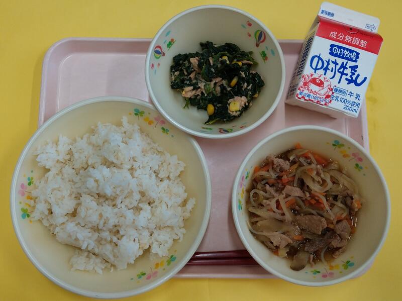 〇 ぶたどん(むぎごはん)〇 ほうれんそうとコーンのあえもの