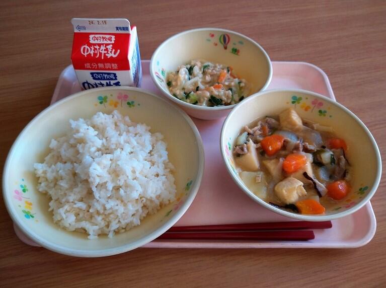 今日は高鍋東小学校6年生のリクエストメニューです。みなさんのすきなメニューが並びましたね。今日のサラダはアメリカンサラダ、いつもはおやつに食べるポテトチップを使って作りました。サラダという名前は、ラテン語の塩という意味の「サル」からきています。むかし、レタスなどの野菜は生で食べられていましたが、食欲を増すために生の野菜に塩をかけて食べたのがサラダの始まりといわれます。今は、塩をかけるだけでなく、いろいろなドレッシングがあって野菜をおいしく食べられますね。