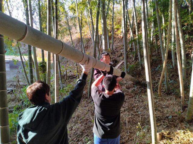 1週間前に竹林で切り出し、加工していただいた竹をドラム缶に立て、発泡スチロールと砂で固定し、わらとわら縄でドラム缶を覆います。最後に花屋さんが、縁起のいい飾りをつけてくださり、豪華絢爛な門松が完成しました。