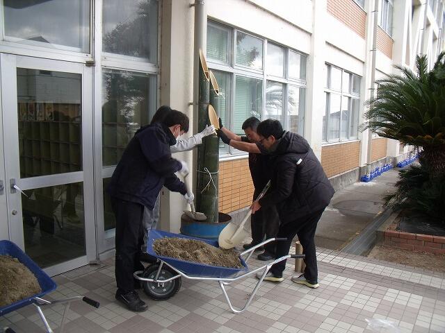 今朝、登校してきた子どもたちは、自分の身長よりも大きな門松に、興味津々でした。これで、気持ちよく新年を迎えることができそうです。