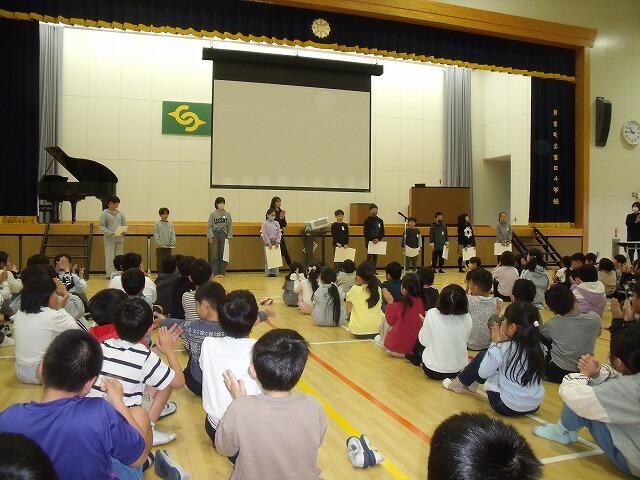 長かった2学期も、今日で終了です。この日は、3時間目に講堂で終業式が行われました。校長先生からは、それぞれの学年でがんばったこと・できるようになったことを写真付きで紹介していただき、児童代表の作文発表では3年生が国語の授業の成果を堂々と述べてくれました。式の後には、冬休みの生活についてのお話や、たくさんの表彰が行われました。