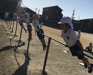 1年生は、鉄棒を使った運動遊びで、さまざまな技にチャレンジをしています。