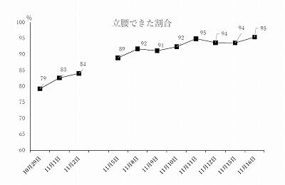 11月は、「立腰をしよう」という目標に全校で取り組みました。正しい「立腰」の仕方や「立腰」することの良さについて教わった後、8日間、授業開始号令時に立腰ができているか評価しました。この折れ線グラフは、その結果です。最終日には、95%の児童が正しい「立腰」をすることができました。