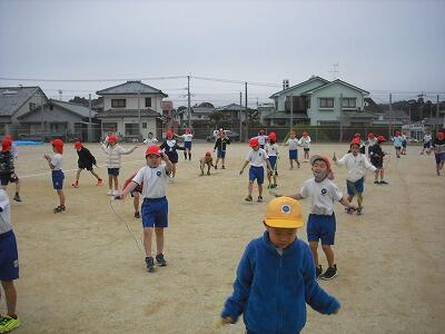 2年生の体育では、なわとびを頑張っています。とても寒いですが、たくさん跳んで体を温めています。目指せ!二重跳びマスター!!!