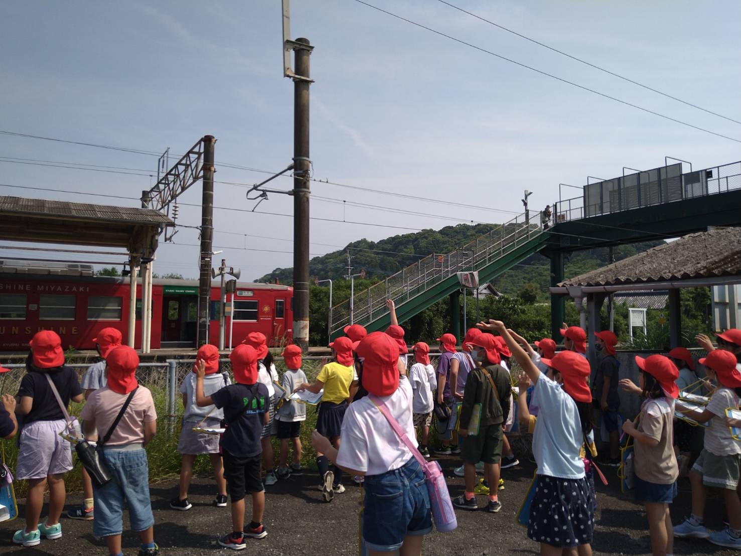 日向新富駅では、たまたま電車の来る時間帯と被ったため、子どもたちが楽しそうに電車に向かって手を振る姿が見られました。