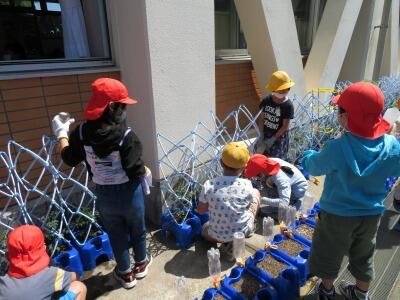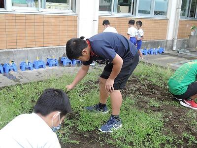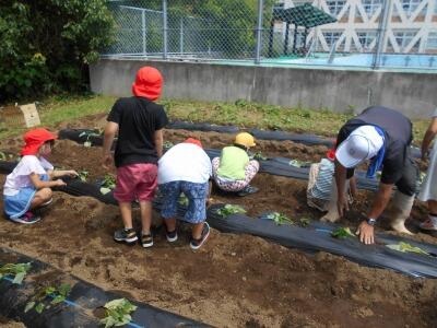 学校用務員さんに教えていただきながら、いもの苗植えをしました。