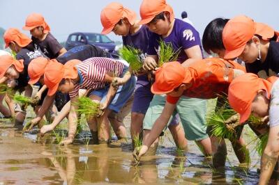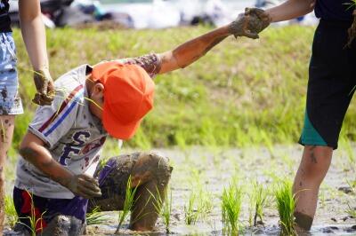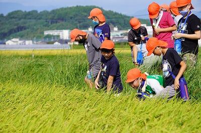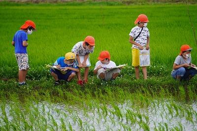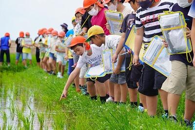 子どもたちは、タニシなどの田んぼの生き物をよく観察していました。