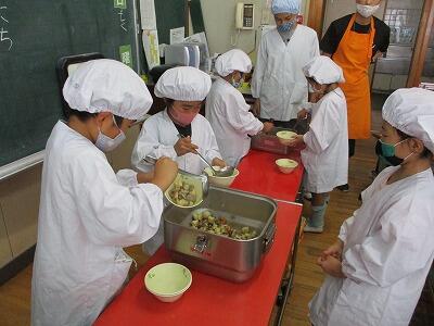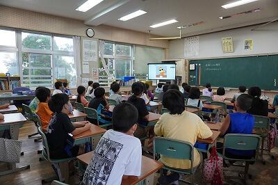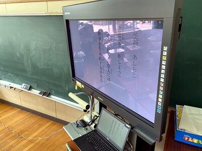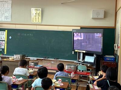 子どもたちは、給食の時間の中で、校長先生のお話を画面越しに聞いていました。