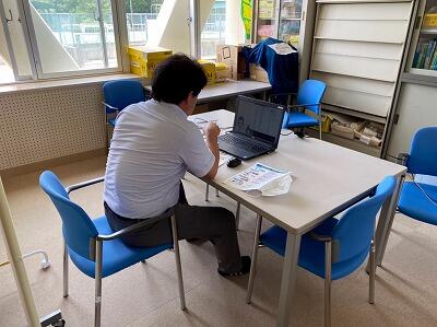 校長先生はパソコンの前で、全校に向けてお話をしました。