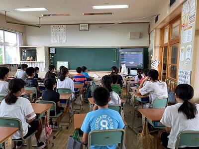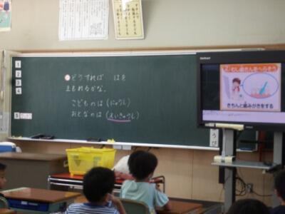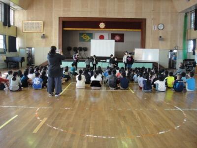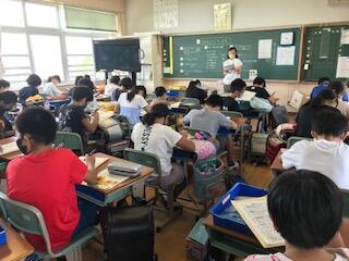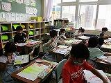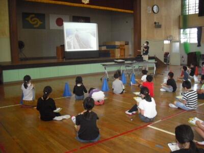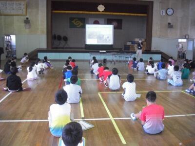 4年生では講師の方に来ていただき、アカウミガメに関する講話を行いました。富田浜は、日本でも有数のアカウミガメの産卵地であることや、孵化した後の子ガメは、遠いアメリカやメキシコの海まで渡って、20年くらいの時を経て再び生まれた所に戻ってくるということなど、新しい事をたくさん聞いて興味芯々の様子でした。