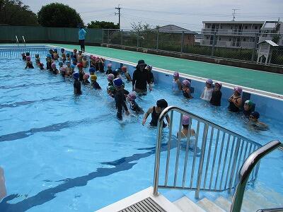 入学して初めての水遊びです。浅いプールで水慣れをして、水位の低くなった大きいプールにも入りました。みんな楽しく水遊びをすることができました。