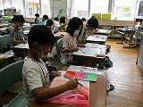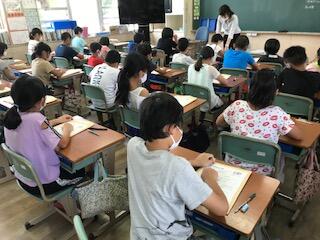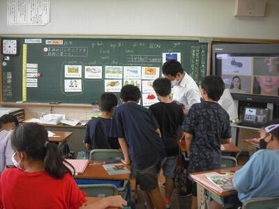 6年生の外国語の授業では、夏の風物詩「七夕飾り」を使って、願い事を英語で書く学習を行いました。