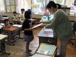 2度の臨時休校をはさみ、今日で1年生が51日、2~6年生が55日の登校となりました。新しい生活様式の中で頑張ったこともたちに、通知表が渡されました。