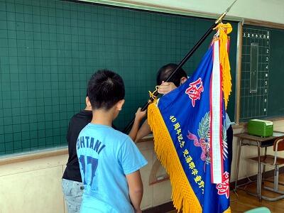 各団の色が決まった後、団長・副団長が各学年の廊下を歩きながら、団旗を披露しました。
