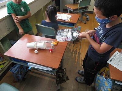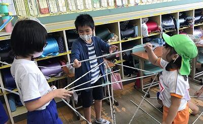 生活科の授業で一人で遊べるおもちゃを作っています。一人一人が真剣に考えて自分なりに工夫しながら頑張っているところです。子どもの自由な発想がとても素敵です。