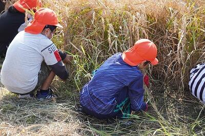 10月12日(月)、稲刈りをしました。はじめに、鎌を使って刈りました。